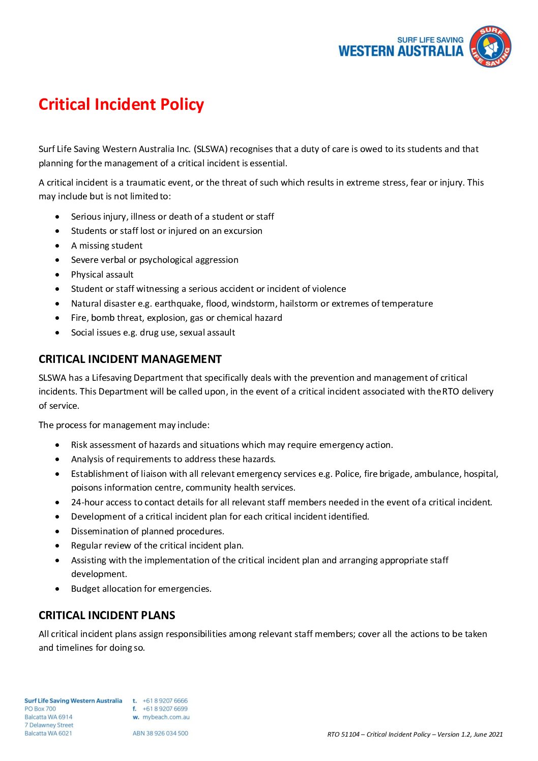 Critical Incident Policy June 2021 v1.2